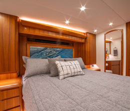 All the way forward you find the VIP quarters with a raised queen bed, a full private head, and ample storage. Mounted flush with the teak cabinetry is a stand-alone Garmin display, allowing the captain to keep an eye on systems and positioning during those overnight trips and to monitor anchor and collision alarms.